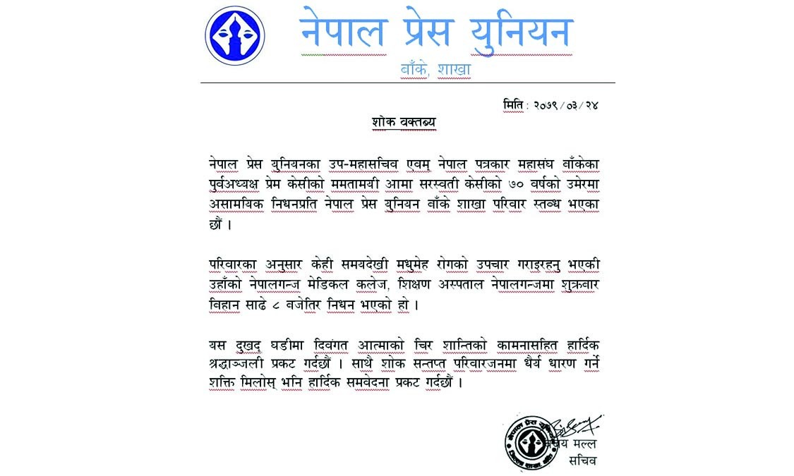 यसैबीच युनियन उप–महासचिव केसीलाई मातृशोक परेको प्रति नेपाल प्रेस युनियन बाँके शाखाले स्तब्ध भएको जनाएको छ ।