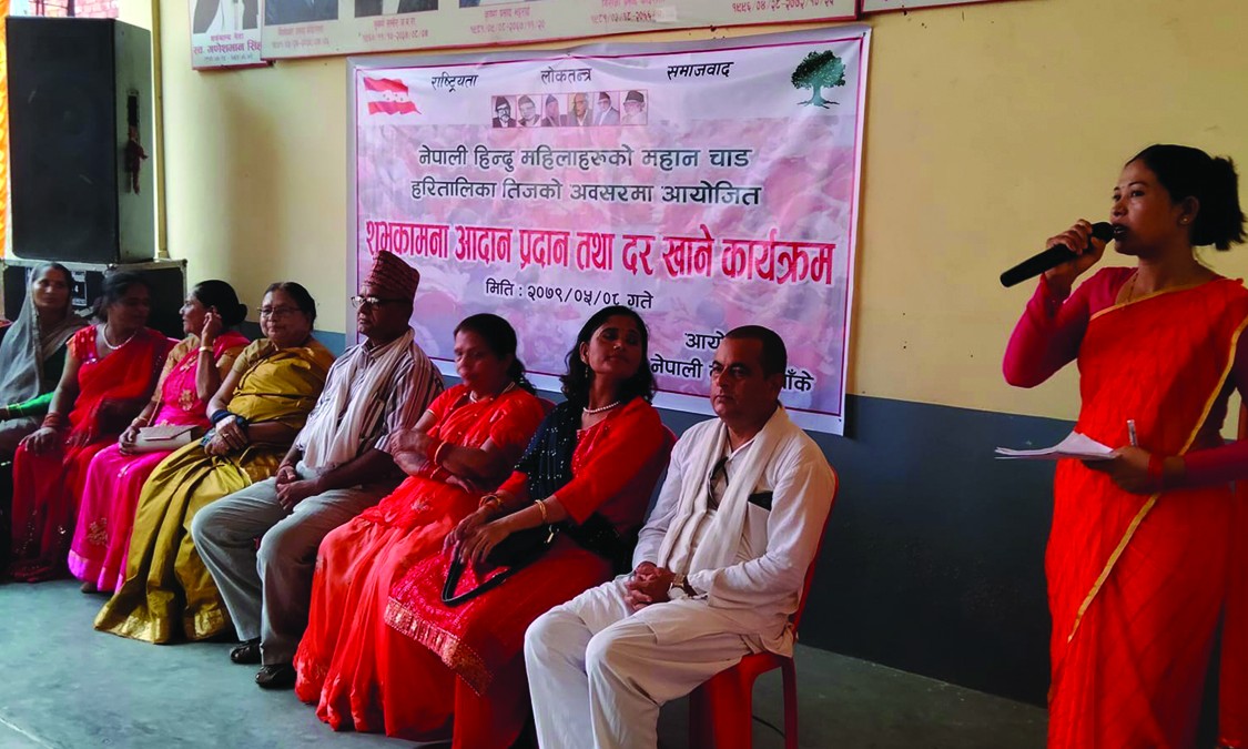 तीज मिलन तथा दर कार्यक्रमका संयोजक एवम् जिल्ला सहसचिव रेनुसिंह ठाकुरको सभापतित्वमा भएको तिज कार्यक्रममा सहभागी नेता तथा नेतृहरुले हिन्दू नारीहरुको महान पर्व तिजले एकता, सद्भाव र सम्बृद्धि स्थापित गरोस् भन्ने शुभकामना दिएका थिए ।