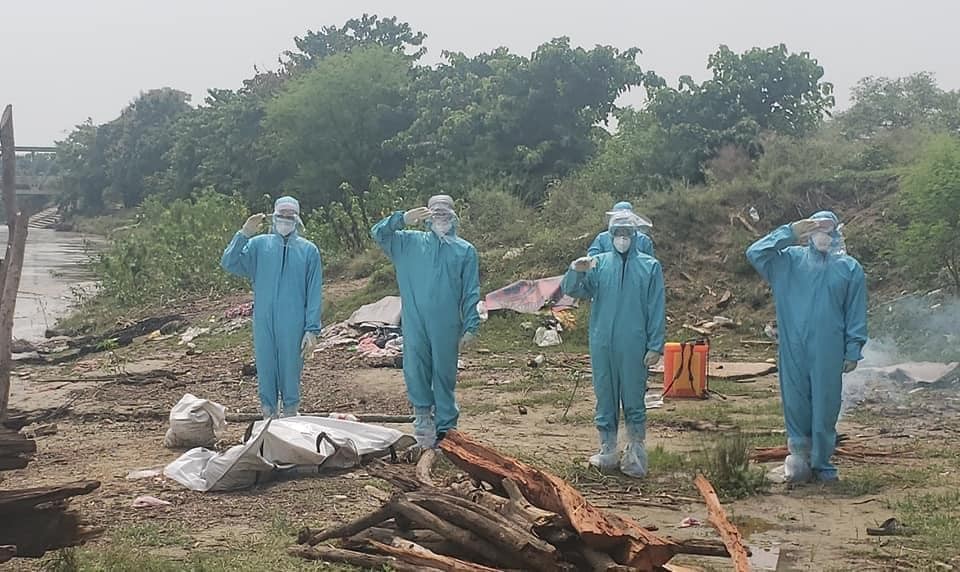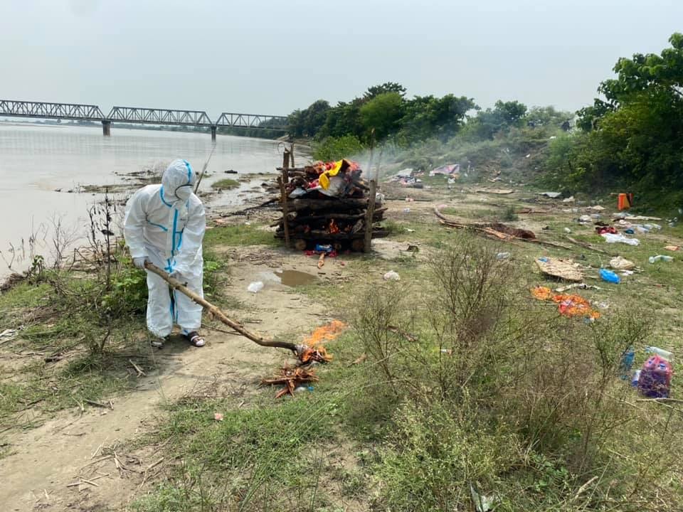 नेपाली सेनाको शव ब्यवस्थापन टिमद्वारा कोरोना संक्रमणबाट मृत्यु भएका घलेको दाहसंस्कार गरिदैं । तस्विरः विमल चन्दको फेसबुकबाट साभार