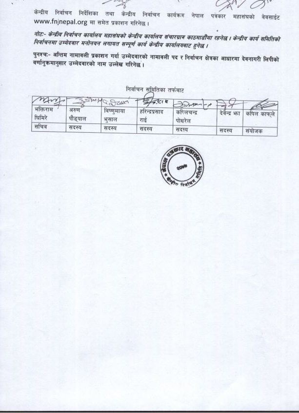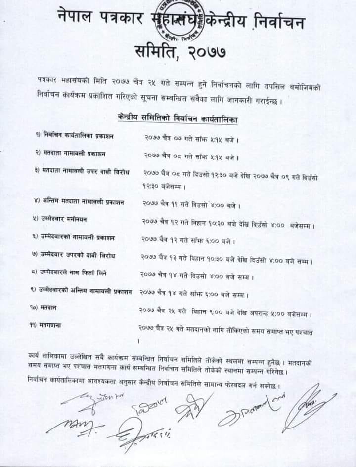 यसैबीच आगामी चैत २५ गते हुने नेपाल पत्रकार महासंघको प्रत्यक्ष निर्वाचनका लागि निर्वाचन तालिका सार्वजनिक भएको छ ।