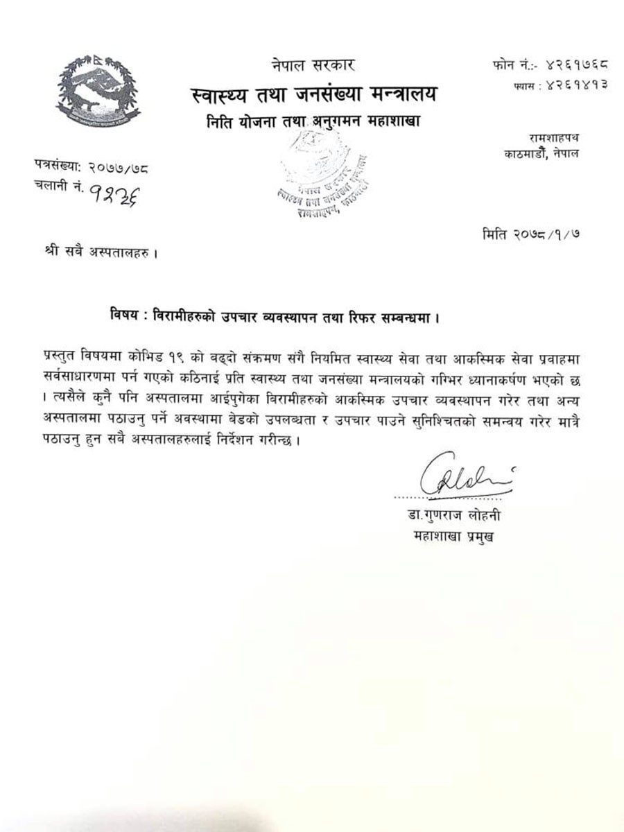 मंगलबार मन्त्रालयको नीति, योजना तथा अनुगमन महाशाखा प्रमुख डाक्टर गुणराज लोहनीले सबै अस्पताललाई पत्राचार गर्दै कुनै पनि अस्पतालमा आइपुगेका बिरामीको आकस्मिक उपचार व्यवस्थापन गरेर तथा अन्य अस्पतालमा पठाउनु परे आवश्यक समन्वय गरेर मात्र पठाउन निर्देशन दिएका छन् ।