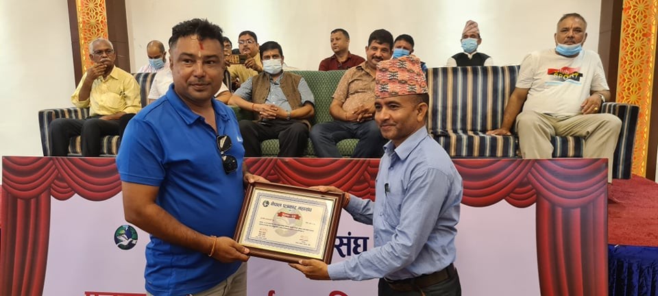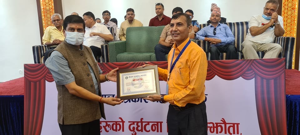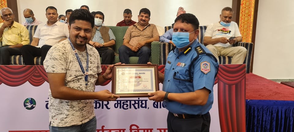 नेपालगन्जमा आज(शुक्रबार) आयोजित एक कार्यक्रममा नेपाल पत्रकार महासङ्घका केन्द्रिय अध्यक्ष विपुल पोखरेलको उपस्थितिमा कोभिड–१९ रोकथाम र नियन्त्रणमा महत्वपूर्ण भूमिका निर्वाह गर्नेलाई सम्मान गरिएको हो ।